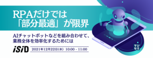 そこで本セミナーでは、RPAとAIチャットボットなどを組み合わせることで「部分最適」の限界を克服し、業務全体の効率化を実現する方法を紹介します。 RPAとAIチャットボットの連携によって「作業からの解放」を実現し、通知機能によってユーザに新たな気付きや価値創造を促すこともできる、電通国際情報サービス社のソリューション「チャットボットコンシェルジュ」について紹介しますので、ぜひご参加ください。
