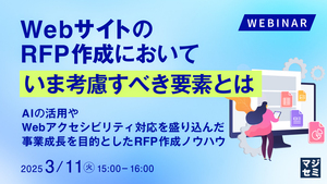 本セミナーでは、Webサイトの目的を実現し制作・リニューアルを成功させるためにRFP作成時に考慮すべき内容について解説いたします。 特に、これまでの考え方から脱却し「いま」考慮すべきポイントにフォーカスしてお伝えします。 例えば、Webアクセシビリティの対応が2024年の改正法施行により努力義務となりましたが、努力義務にとどまっているために、対応を行っている企業はまだ多くはないといえます。 しかし、アクセシビリティを必要としているユーザーは、より使いやすいWebサイトを選択すると考えられるため、中長期的にみると事業成長に影響が出てくると考えられています。 また、近年AIの活用が様々な分野で進んでおり、Webサイトにおいても活用が必須ともいえる状況になっています。 セミナーの中では、いま取り入れるべきポイントを踏まえたうえで、目的や解決すべき課題に応じ、どのように要件を整理し定義していけばよいかといった点から、プロジェクトを進めるうえでトラブルになりやすい点を未然に防止する手法などをお伝えいたします。 RFPをしっかりと作りこむことにより、制作会社とのミスコミュニケーションがなくなるだけではなく、Webサイトをあるべき姿にしていくことが可能です。 Webサイトの制作やリニューアルを検討されている方や、すでにプロジェクトを進行している方、制作会社とのコミュニケーションに課題を感じている方へ特におすすめの内容です。