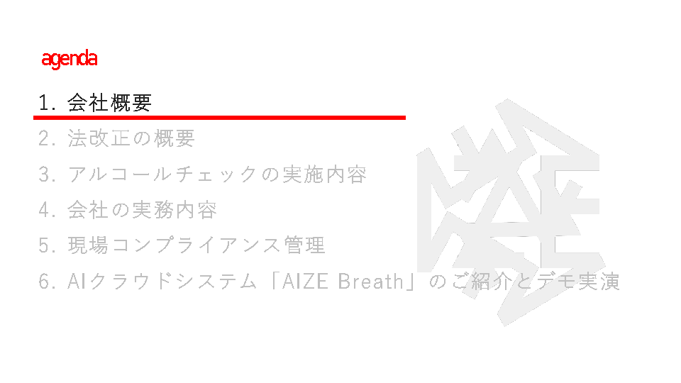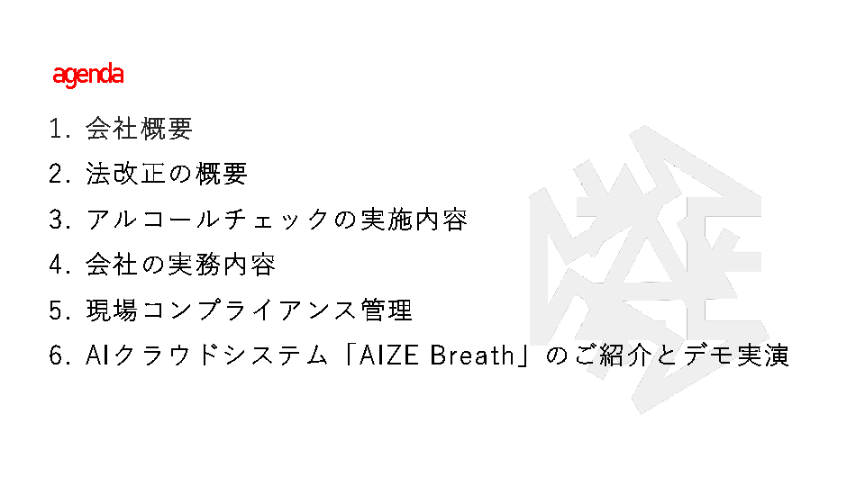 本セミナーでは、AI顔認証とアルコールチェックと検温を一連の動作で行う「AIZE Breath」を使った、運行日誌の自動作成についての、具体的な方法をご紹介します。