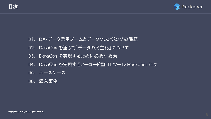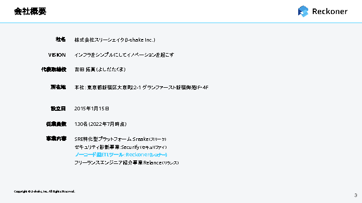 煩雑なデータ連携作業の負担を大幅削減できる、スリーシェイク社が提供するノーコード型ETLツール「Reckoner」の紹介も行う予定です。