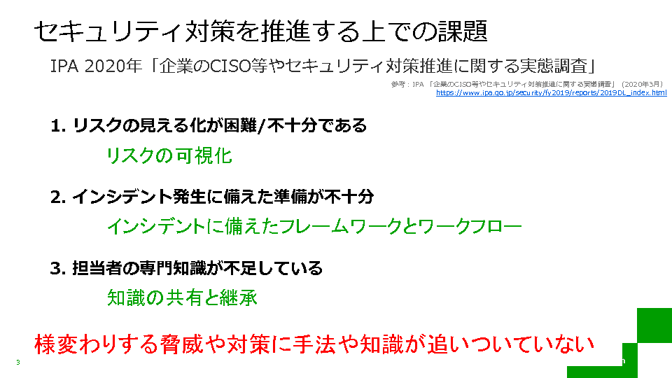 ここ数年、企業・組織のセキュリティ担当者の多くが悲鳴をあげており、今までに無いほどの負担がのしかかってきました。日本国内でも猛威を振るうランサムウェア攻撃、従業員を騙すビジネス・メール詐欺(BEC)、最近多くなっているAPI攻撃やコンテナの脆弱性を狙う新種の攻撃など止めどなく攻撃は続いています。