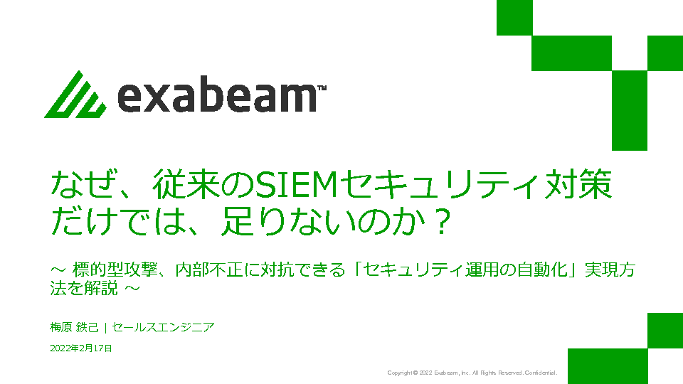10:05~10:45 なぜ、従来のSIEMセキュリティ対策だけでは、足りないのか? ~ 標的型攻撃、内部不正に対抗できる「セキュリティ運用の自動化」実現方法を解説 ~