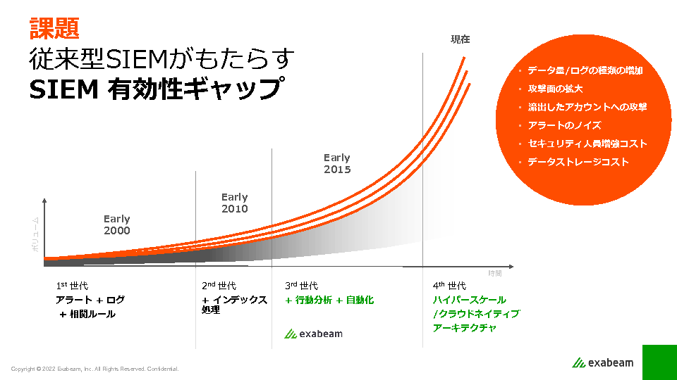 しかし、データの増加やサイバー攻撃の巧妙化、クラウド移行が進んだ結果、オンプレミスのルールベースの検出方式を取る従来型SIEMの限界が指摘されるようになりました。