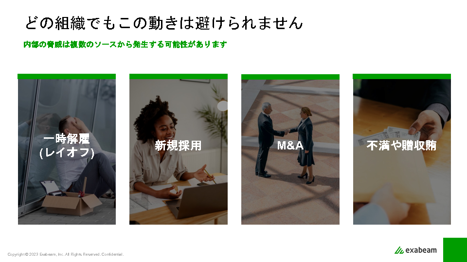 特に、ビジネスの縮小・拡大や従業員などの関係者の出入りなど、混乱しやすい時期ほど、あらゆる変化のために内部脅威が見過ごされて内部不正が起こりやすくなります。