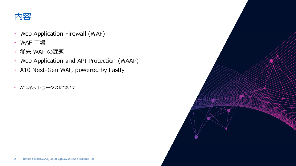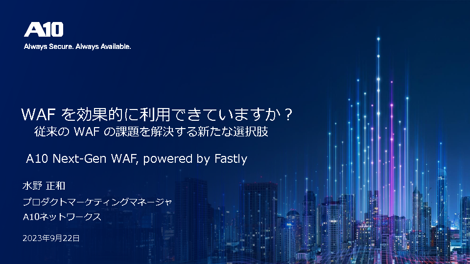 本セミナーでは、WAFの動向や従来のWAFの課題についておさらいするとともに、従来のWAFの様々な課題をクリアし効果的かつ実用に耐えうるA10ネットワークスの次世代型WAFについてご紹介する予定です。