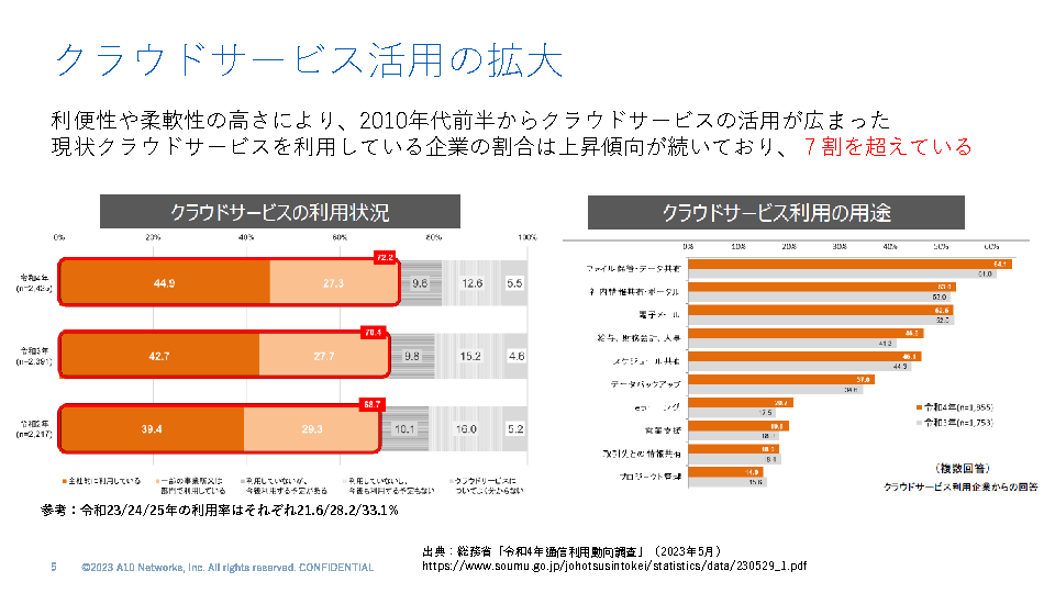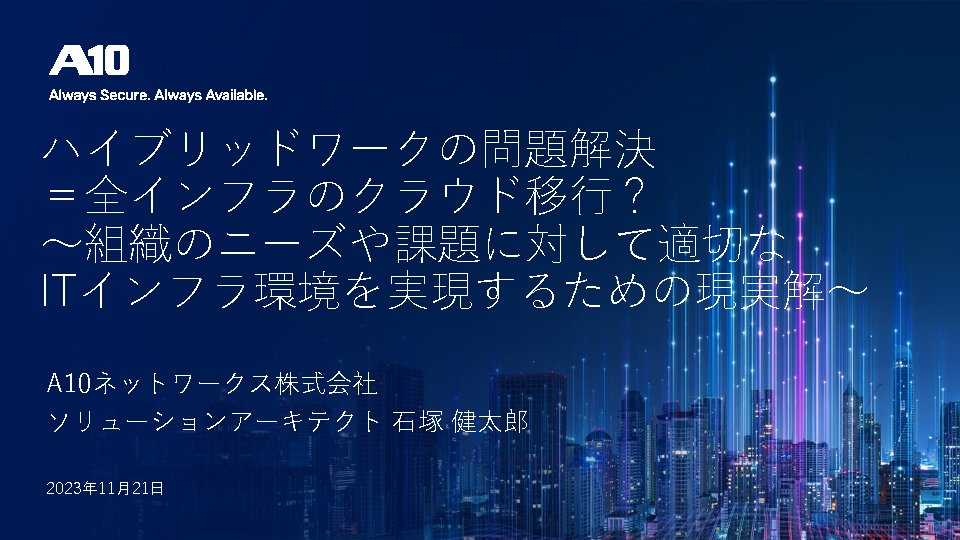 A10ネットワークスが提供するハイブリッドセキュリティソリューションを用いれば、オンプレミスとクラウドを組織のニーズに合わせて適切に組み合わせ、インフラの柔軟性を保ちつつ、セキュリティとコストのバランスを保つためのコントロールを維持することが可能です。 具体的にどのようにオンプレミスとクラウドを最適に組み合わせるか、事例を交えて詳しく説明します。 ネットワークの運用にお悩みの方はぜひご参加ください。