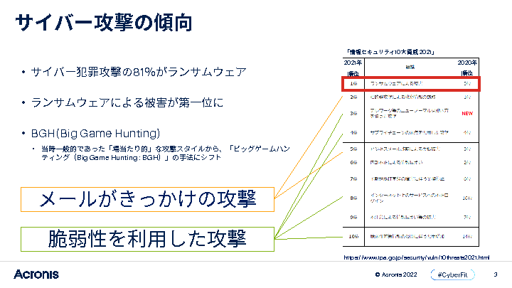 また、IPAが2022年1月に公表した「情報セキュリティ10大脅威 2022」(組織編)では、「ランサムウェアによる被害」が2年連続で1位となりました。