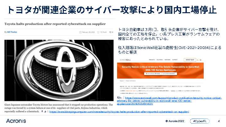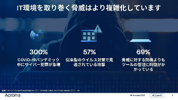 サイバー攻撃は巧妙化し、サイバー攻撃者は休むことなく我々に攻撃を仕掛けてきます。従来のセキュリティ対策では進化し続けるサイバー攻撃に対抗すること困難となりました。高度な脅威、未知の脅威に対抗するアクロニスの製品・最新テクノロジーをご紹介します。