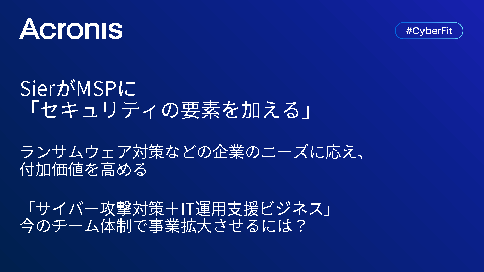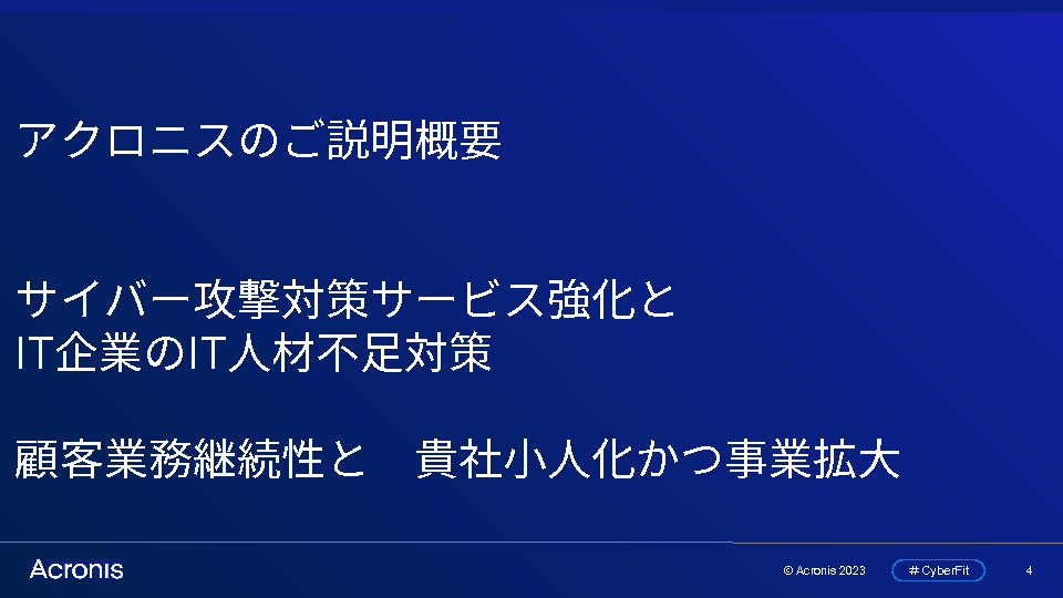 セミナーを主催するAcronisは、顧客企業のIT運用支援ビジネスにおける課題への解決策として、統合型データ保護「Cyber Protection」プラットフォームを提供しています。また、「Acronis Cyber Protect」を中核とするIT運用代行ソリューションについて「Acronis Cyber Protect Cloudを採用して良かった」という具体的なパートナー企業の事例もご紹介します。