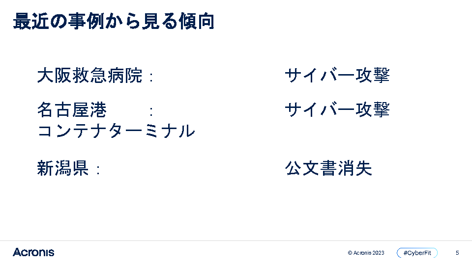 企業ITのリスクは、機器の故障、操作ミス、災害によるデータ喪失からランサムウェアをはじめとする巧妙なサイバー攻撃まで多様化しています。従来のバックアップやセキュリティソリューションの導入だけでは、企業の情報資産の保護と事業継続は困難になりつつあります。アクロニスの「バックアップ」、「セキュリティ」、「管理」を統合したAcronis Cyber Protect Cloudで実現する「サイバープロテクション」を紹介いたします。
