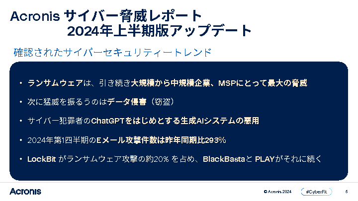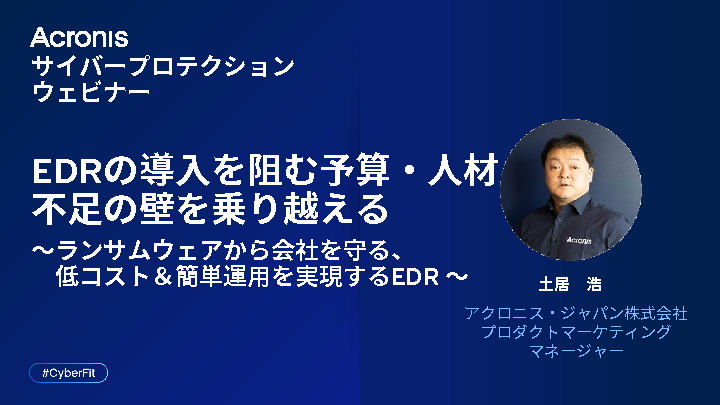 アクロニスのEDRは、シンプルな導⼊と効率的な運⽤管理を実現し、バックアップとの統合で事業継続性も確保する、中堅中⼩企業に最適なEDRソリューションです。またセキュリティ、運用管理業務自体を戦略的にアウトソースする場合には、アクロニスMSPパートナーのMDR(マネージド デテクション & レスポンス)やXDR(エクステンデッド デテクション & レスポンス)をご利用いただくことも可能です。本セミナーでは、ランサムウェア攻撃の最新動向から、中堅中⼩企業に求められるEDR導⼊のポイントまで詳しく解説します。ぜひご参加ください。