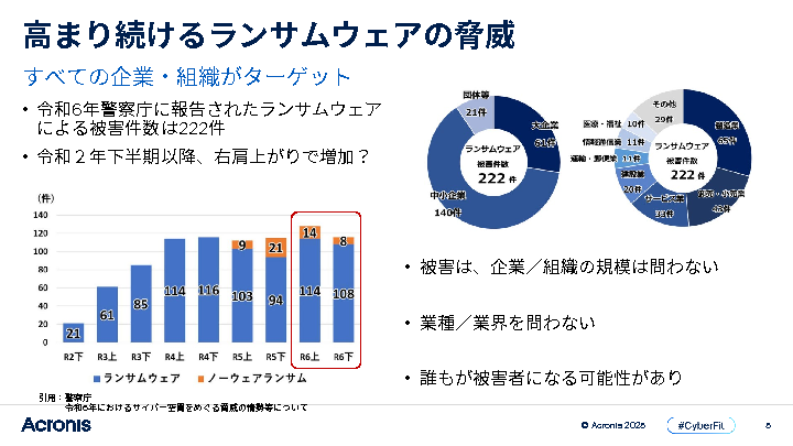 アクロニス脅威リサーチユニット(TRU)の予測によると、2025年はAIを活用したサイバー攻撃の手法が進化し、ランサムウェアやデータ窃取のリスクが急増すると見られています。特に医療機関は、機密性の高い患者データを扱うため標的となりやすく、被害が深刻化する可能性が高い。2024年下半期にはメールを悪用した攻撃が前年同期比で197%増加し、ゼロデイ脆弱性の悪用やサプライチェーン攻撃が拡大。また、医療DXの進展に伴い、ネットワーク接続された医療機器やクラウド基盤を狙う攻撃が増加すると予測されています。従来のセキュリティ対策だけでは対応が困難になり、高度な脅威検知・防御と迅速な復旧を兼ね備えた統合型のサイバープロテクションが不可欠となります。