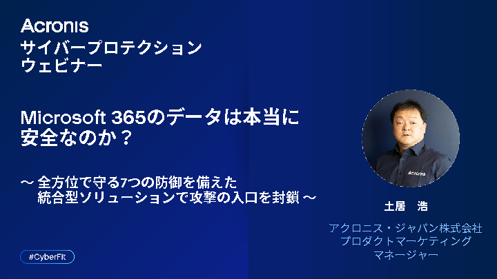 本セミナーでは、Acronis Ultimate 365が持つ7つの統合防御機能を活用し、Microsoft 365を取り巻くサイバーリスクにどう立ち向かうかを解説します。バックアップ、Eメールセキュリティ、アーカイブ、XDR、アプリケーション保護、セキュリティ意識向上トレーニング、態勢管理まで、これまで別々のソリューションで対応していた領域を、1つのパッケージで完結させるのが強みです。複雑な管理を大幅に簡素化しながら、運用コストの削減、コンプライアンス対応、復旧力の向上を同時に実現。本セミナーでは、その導入効果と活用法を具体的にご紹介します。