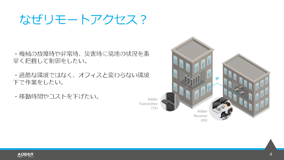 本セミナーでは、数枚の画面といった小規模な制御室から、数百台のモニタがある大規模なシステムまで幅広く対応可能な高性能IP-KVMである「ADDERLink INFINITYシリーズ」、「IPEPSシリーズ」を用いた様々なIP-KVMの構成の例をご紹介いたします。