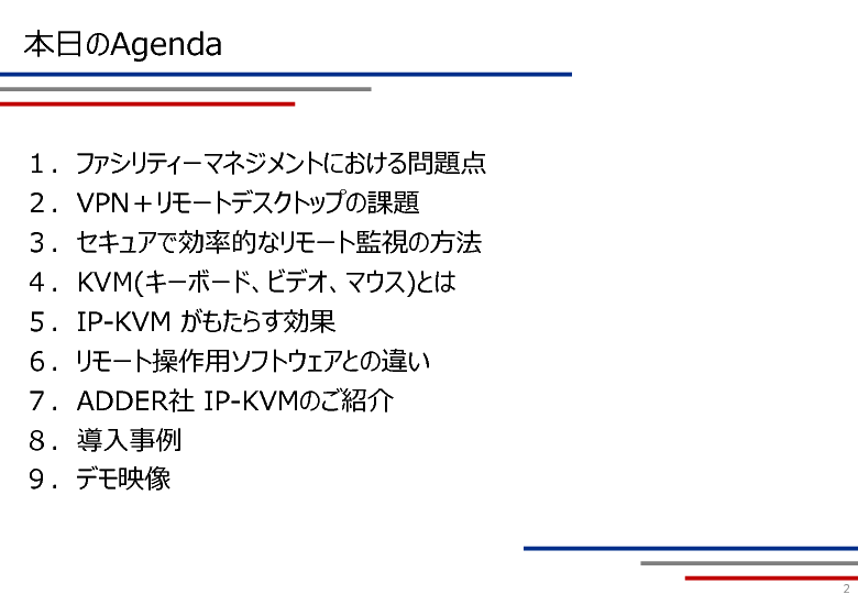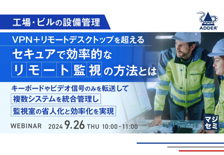 本セミナーでは、数枚の画面といった小規模な制御室から、数百台のモニタがある大規模なシステムまで幅広く対応可能な次世代IP-KVMである「ADDERLink INFINITYシリーズ」を通して、セキュアな遠隔メンテナンスを実現するための様々な構成例を詳しく解説します。