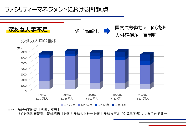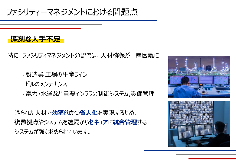 少子高齢化に伴い、国内の労働力人口の大幅な減少が予測されています。特に、製造業の工場の生産ラインやビルのメンテナンス、電力・水道などの重要インフラの制御システムの設備管理といったファシリティマネジメント分野では、人材確保が一層困難になっています。