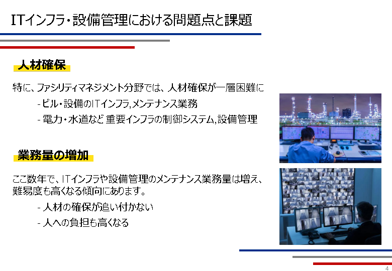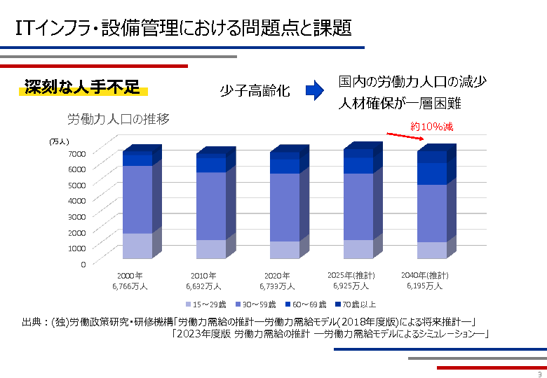 近年のDX(デジタルトランスフォーメーション)に加え、IoTやエッジデバイスの増加、さらにはシステムの多様化・高度化にともない、障害対応の難易度は年々高まっています。一方で、現場では深刻な人手不足が顕在化しており、限られた人員で効率的な運用と障害対応が求められています。