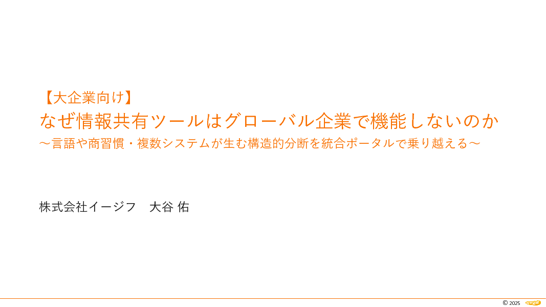 11:05~11:45 【大企業向け】なぜ情報共有ツールはグローバル企業で機能しないのか 〜言語や商習慣・複数システムが生む構造的分断を統合ポータルで乗り越える~