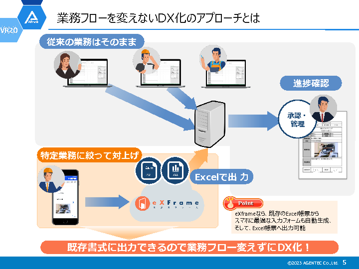 ご紹介する「eXFrame」は、現場での業務フローを変えずに、ペーパーレス化やExcelからの脱却を実現できる点で好評をいただいています。