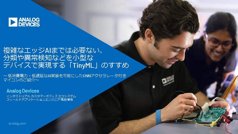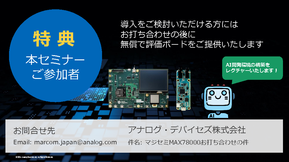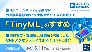 本セミナーでは、アナログ・デバイセズが提供する、革新的なAIアクセラレータ付き低消費電力マイコンである「MAX78000シリーズ」を通して、組込み機器にシンプルなAIタスクを実行させる上で、どんな活用方法があるのか、その特徴や利点を具体的な事例を交えて詳しく解説します。