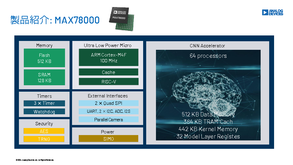 「MAX78000シリーズ」は、エッジのIoTデバイスに低消費電力・低遅延な人工知能の実装を可能にした畳み込みニューラルネットワーク(CNN)アクセラレータ付きマイコンです。一般的な汎用マイコンと比較して100倍以上のエネルギー効率と100倍の高速推論を実現しており、プロセッサーと比較しても非常に高いコスト効率が実現できます。このため、低コストで高効率のAI処理が可能となります。