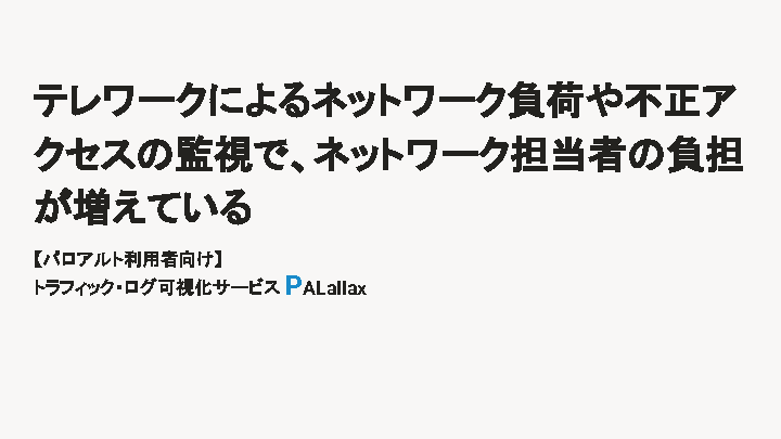 本セミナーでは、パロアルトの次世代ファイアウォール通信可視化サービス「PALallax」を活用した効率的なログ・トラフィック解析をご紹介します。テレワークによるネットワーク負荷や不正アクセス監視で増加したネットワーク担当者の負担を、少しでも軽減できる取り組みを解説していきます。パロアルトの使いにくさに課題を感じている担当者必見の内容です。