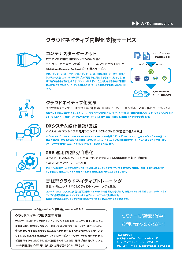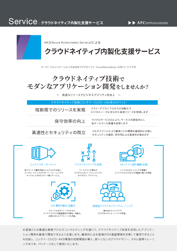 エーピーコミュニケーションズではクラウドネイティブ内製支援化サービスを展開して、企業のDX推進をサポートしています。