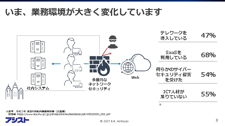 コロナ禍以前は1700件/月だったセキュリティインシデントの報告数は、2020年の9月には約5400件に達し、セキュリティにおいて既存の「情報は社内で守る」という境界型からの強制的な移行が、求められています。