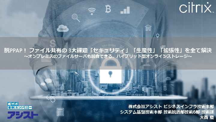 複数のストレージを統合することで、利用ユーザーからのアクセスを一元化できるアシスト社のクラウドストレージ「Citrix ShareFile」についても紹介します。