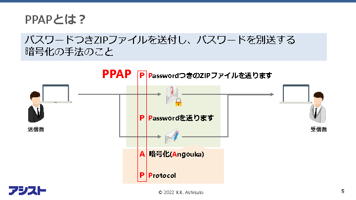 パスワードで暗号化したファイルをメール添付で送信し、そのあと別のメールでパスワードを送る、いわゆる「PPAP」が多くの日本企業でファイル共有の手段として用いられてきました。