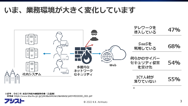・クラウドサービス、SaaSの利用拡大に伴い、Webセキュリティ、サイバー脅威の対策に課題がある