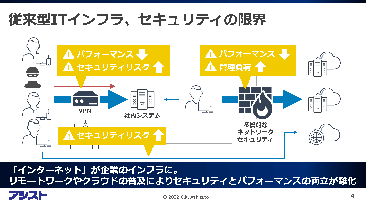 また、リモートワーカー急増によりトラフィックが増加すると遅延が起きやすい等、パフォーマンス面にも課題を抱えています。
