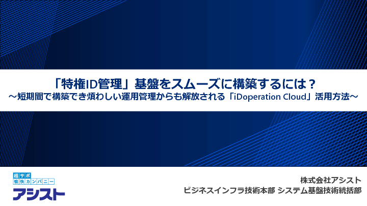 本セミナーでは、SaaS型の特権ID管理製品である「iDoperation Cloud」を活用してスムーズに特権ID基盤を導入する方法を、認定ゴールドパートナーであるアシストが具体的に解説。既存システムに影響することなく短期間で構築でき、ビジネスのスピード向上にも役立てられるヒントをご紹介します。「特権ID管理製品をスピーディーに導入したい」「バックアップなどの運用業務やサーバー障害時の復旧対応などの運用負荷を軽減したい」とお考えの方は、ぜひご参加ください。