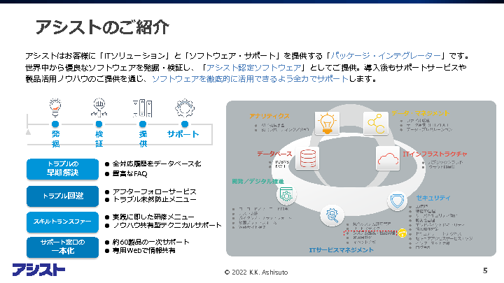 また、Zabbix専任サポート技術者により手厚いサポート体制を提供し、サポート継続率98.7% (2022年7月時点)と高い満足度を誇る、アシスト社によるZabbixサポートサービスについても紹介する予定です。