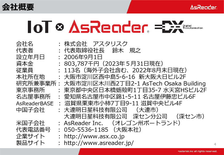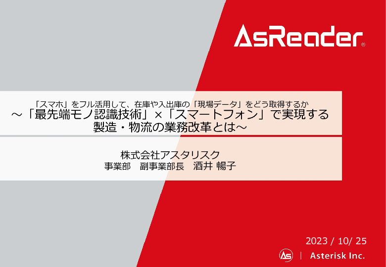 本セミナーでは、最先端の「モノ認識技術」を搭載した「AsReaderシリーズ」を用いて、製造・物流現場の在庫や入出庫のデータ管理で「スマートフォン」を最大限に有効活用する、様々な取組みをご紹介します。