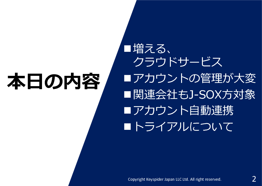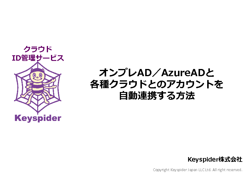 本セミナーでは、オンプレAD/AzureAD(又は人事システム)のユーザーを、各種クラウド(及びオンプレミスのシステム)に自動連携する方法について、クラウドID管理サービス「Keyspider」を使って解説します。