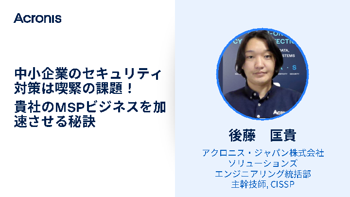 また、サービス提供の課題を解決するソリューションとして、Acronisが提供する統合型データ保護サービス「Acronis Cyber Protect Cloud」をご紹介。ランサムウェアなどの最新の脅威から組織を防御し、バックアップ/ディザスタリカバリといったデータ保護機能を解説。事業者である管理側の労力を最小化し、顧客企業に最適なセキュリティサービスを、より低コストで実現できるメリットなどを解説します。