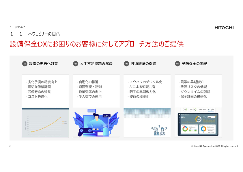 本セミナーでは、長年使われている設備でも現実的にデータ取得・活用を可能にするアプローチとして、ビジネスエンジニアリング株式会社の開発した保全DXパッケージである「mcframe SIGNAL CHAIN」を、日立ケーイーシステムズが長年培ってきたOT(Operational Technology)領域の経験を加えた具体的なソリューションとして、みなさまに紹介します。