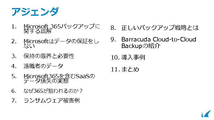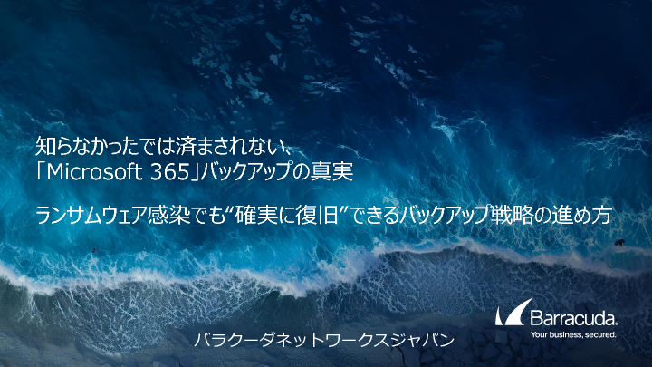 本セミナーでは、実際に起きた復旧失敗の例をもとに、Microsoft 365環境におけるバックアップの重要性を解説します。また、Microsoft 365のバックアップ対策の最適解として「Barracuda Cloud-to-Cloud Backup」をご提案。個別ファイル・フォルダ単位でのリストアや、Entra IDの保護、容量無制限、ランサムウェアスキャン機能など、ランサムウェア対策にも役立つより柔軟で確実なバックアップ運用を支援できる特長などを紹介します。