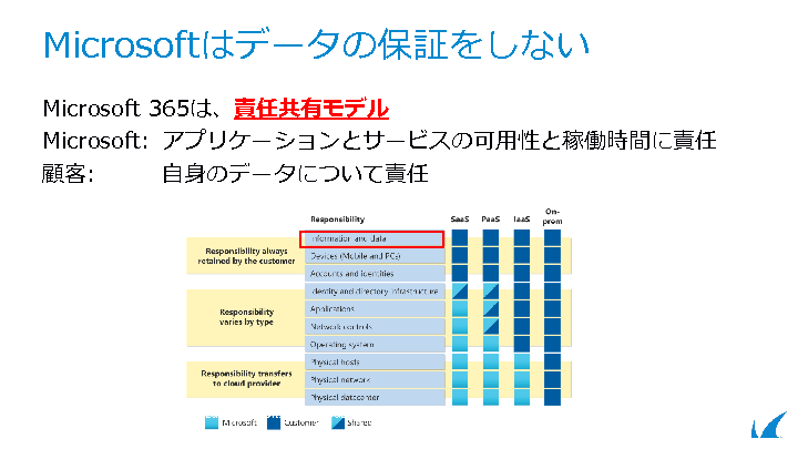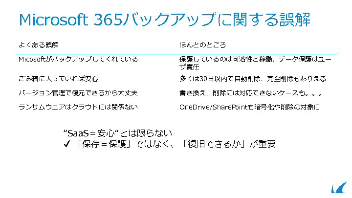 企業の生産性を支える基盤として多くの企業に利用されている「Microsoft 365」ですが、その運用においてデータ保護への備えは十分でしょうか。高度化するランサムウェアなどのサイバー攻撃や自然災害、ヒューマンエラーなどのリスクが増す中、「責任共有モデル」によりMicrosoftは可用性までしか責任を負わず、データ保護はユーザー側の責任とされています。