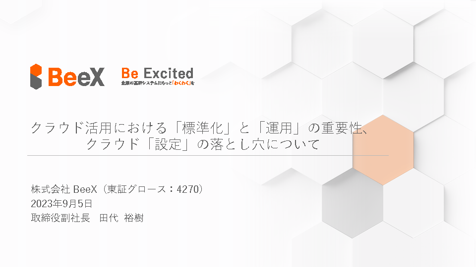 さらに24時間365日の運用・監視、アカウント管理、請求代行などをワンストップで実現する「BeeXPlus」や、お客様環境における人的なクラウドの設定・管理ミスによる脆弱性の診断・分析レポートをご提供する「BeeX Propolis」についてもご紹介。脆弱性を早期に察知・解決するBeeX Propolisの活用方法を取り上げ、セキュリティを強化しながら効果的なクラウド運用を実現するポイントを解説いたします。