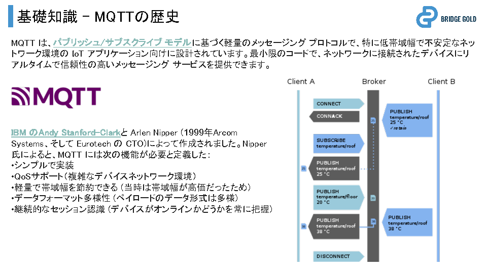 - 帯域幅が限られていたり、ネットワーク接続が不安定な状況でも、高信頼性と効率を提供できるMQTTプロトコルの採用がこれらの要求を満たす。