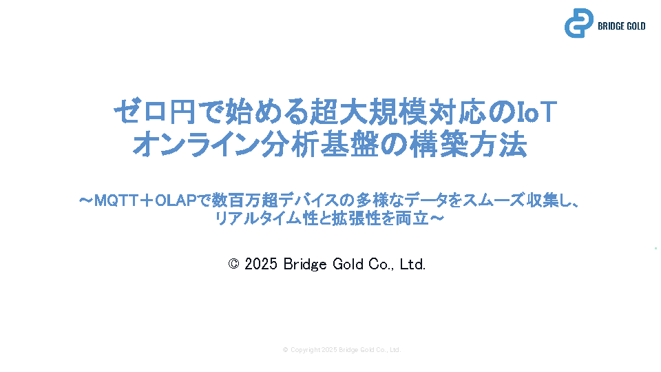 13:05~13:45 【急増するIoTデータ】ゼロ円で始める超大規模対応のIoTオンライン分析基盤の構築方法 ~MQTT+OLAPで数百万超デバイスの多様なデータをスムーズ収集し、リアルタイム性と拡張性を両立~