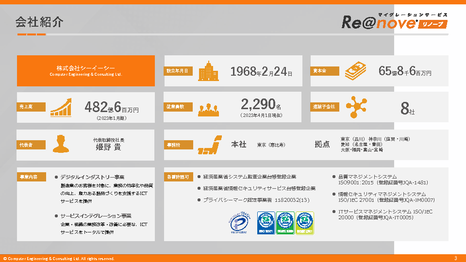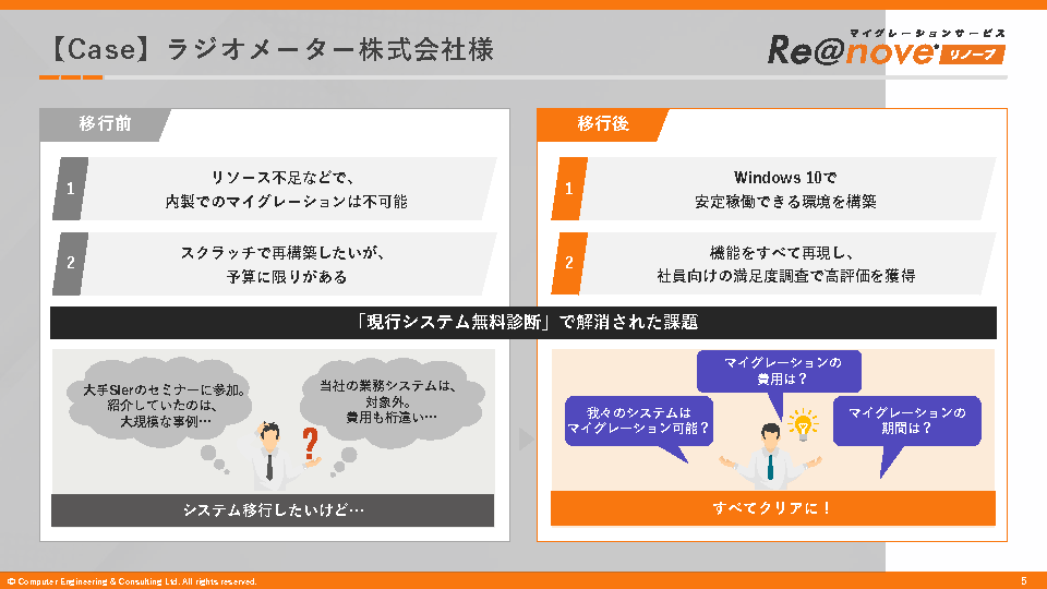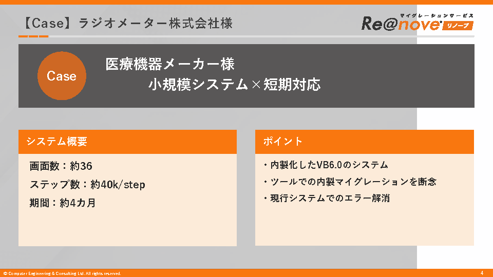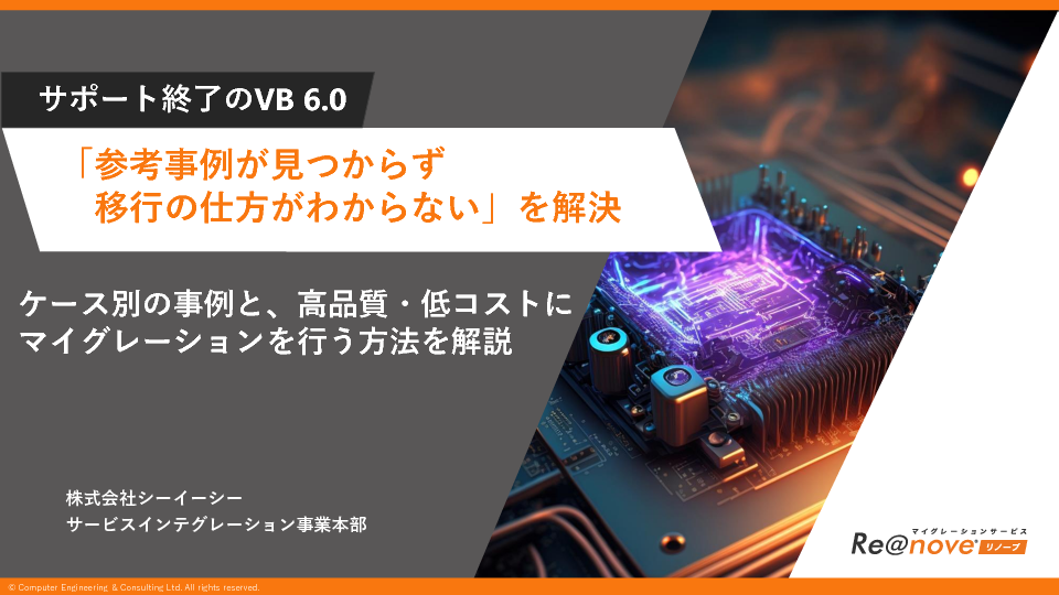 また、シーイーシー独自の「VB .NETシステム変換ツール」を活用し、手作業によるシステム変換を10%未満に抑え、平均変換率90%以上を実現した高品質・低コストでのマイグレーションサービス「Re@nove(リノーブ)」についても詳しく紹介します。
