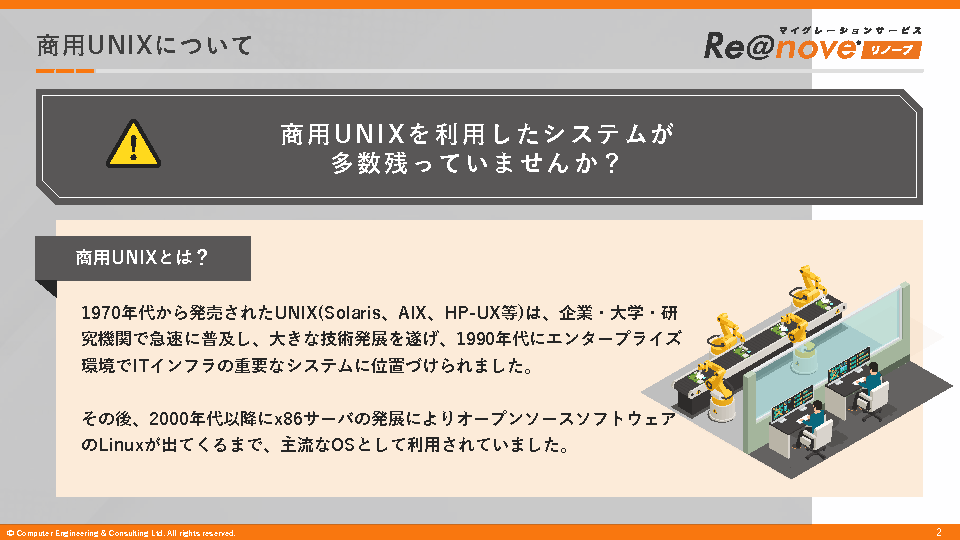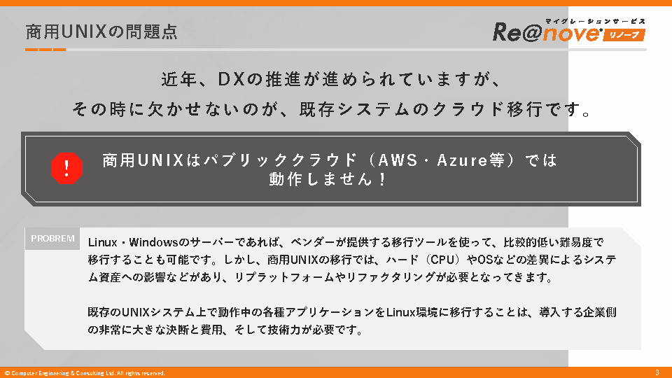 エンタープライズシステムの多くは、長年Solarisや AIX、HP-UXといった商用UNIXを基盤としてきました。これらのシステムは、ミッションクリティカルな業務を支える重要な役割を担ってきましたが、一方でクラウドファーストの時代においては、その存在が足かせとなりつつあります。実際、多くの企業では、基幹システムやWebサーバー、データベースサーバーなどにUNIXを採用しており、それらを現行のまま維持し続けることが、DX推進における大きな障壁となっています。クラウドへの移行を進める上で、これらの商用UNIXをどのように扱うかが、喫緊の課題として浮上しているのです。