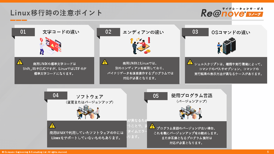 UNIXを使い続けることには、いくつかの深刻なリスクが潜んでいます。その一つが、2038年問題です。これは、UNIXの時刻表現の限界により、西暦2038年のある瞬間を境に、それ以降の時刻を正しく扱えなくなる問題で、放置すれば大規模なシステム障害を引き起こしかねません。さらに、商用UNIXを使い続ける限り、AWS やAzure、GCPといった主要なパブリッククラウドを活用することができません。クラウドファーストが叫ばれる中、オンプレミスに留まり続けることは、コスト面でも機会損失の面でも大きなデメリットとなります。加えて、UNIXの技術者の高齢化と人材不足も深刻化しており、将来的なシステム維持も危ぶまれる状況です。