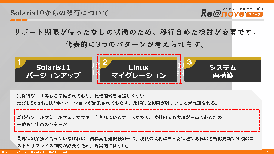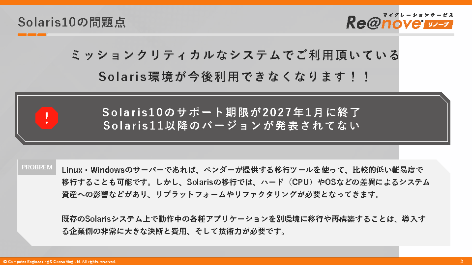 11:05~11:45 【ユーザー企業向け】Solaris 10サポート期限迫る、成功事例からみるLinux移行のポイント〜既存業務への影響なく低コスト・短納期で対応する最適な方法〜