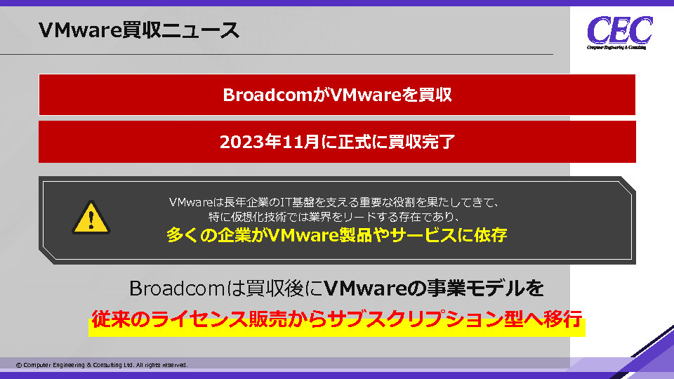 Broadcom社によるVMwareの買収は、企業のIT基盤戦略に大きな影響を及ぼしています。特に、ライセンス体系の変更や今後のサポート体制に対する不安が高まり、多くの企業が移行を検討し始めています。しかし、長年VMware環境で運用してきた企業にとって、移行先の選定は簡単ではありません。既存システムとの互換性や運用コストの変化、移行に伴うリスクなど、多くの要素を慎重に検討する必要があります。