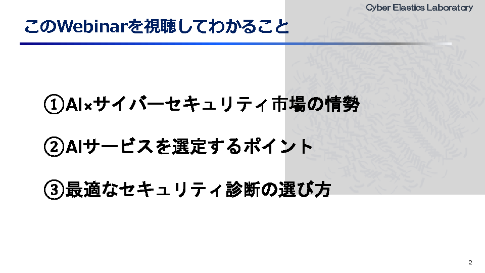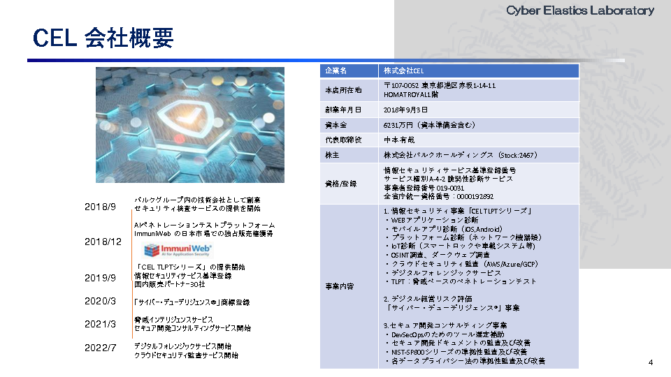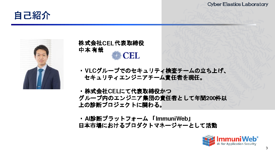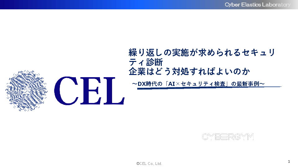 本セミナーでは、従来の手法と比較して3倍はやい・やすい・高品質な、AIを利用したセキュリティ診断サービス「CEL TLPTシリーズ」を、実際の具体的な事例と共にご紹介いたします。