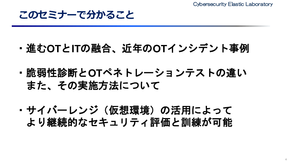 本セミナーでは、OT環境のセキュリティ対策として重要な手法であるOTペネトレーションテストの活用法を、さまざまな実践事例を通して詳しく説明します。また、サイバー攻撃や防御の演習のためにOTネットワークの仮想空間を構築するサイバーレンジの活用事例についても紹介します。